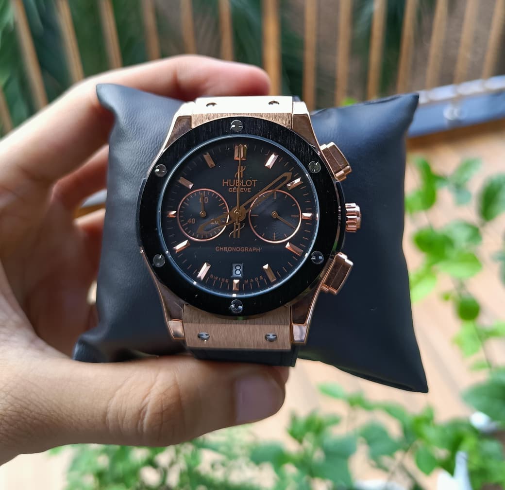 Hublot Rose Gold & Black Chronograph Watch with Iconic H-Screws